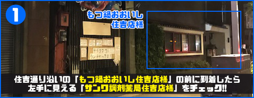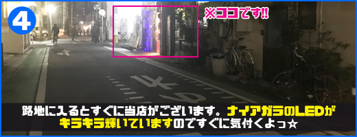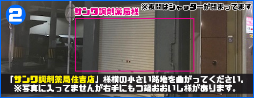 住吉バス停すぐそばにある「もつ鍋おおいし住吉店」様を目印にお越しください。「もつ鍋おおいし住吉店」様を正面から見た際に、左手に「サンワ調剤薬局住吉店」様がございます。「サンワ調剤薬局住吉店」様の横の路地に入りますとすぐ右手にゲイバーまじかるバナナがございます。もつ鍋おおいし住吉店様から当店までは徒歩30秒で到着します☆