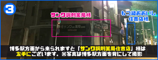 博多駅方面からお越しの場合は「左手」、薬院方面からお越しの場合は「右手」にサンワ調剤薬局住吉店様がございます。